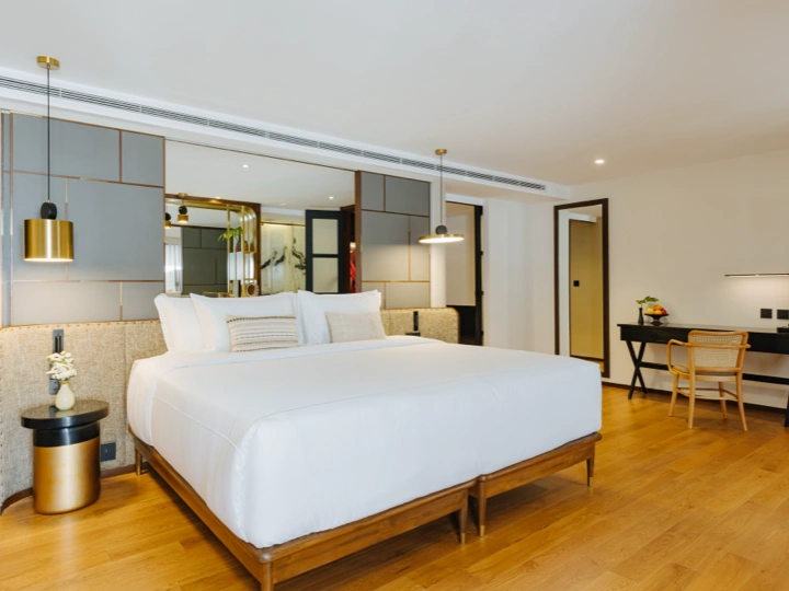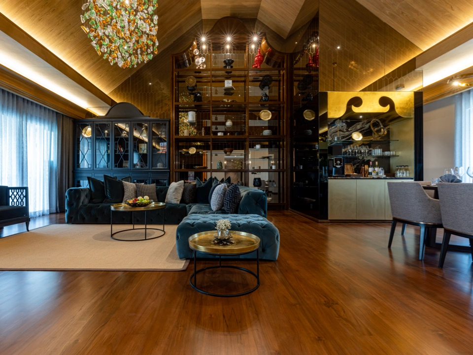 Experience artful elegance in this spacious penthouse with sequin-like lights, rich teak accents, and a rustic pitched roof. Perfect for upscale travelers, it features a large living room with plush seating, Smart TV, minibar, and guest restroom. Relax in the luxurious master suite with a large tub, and enjoy a second bedroom for extra guests.